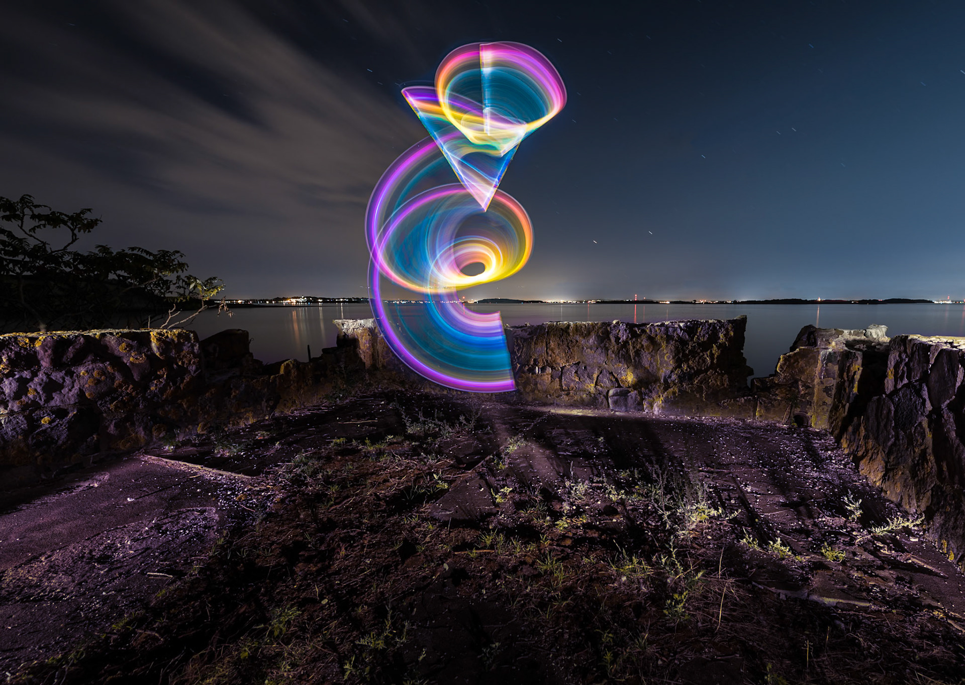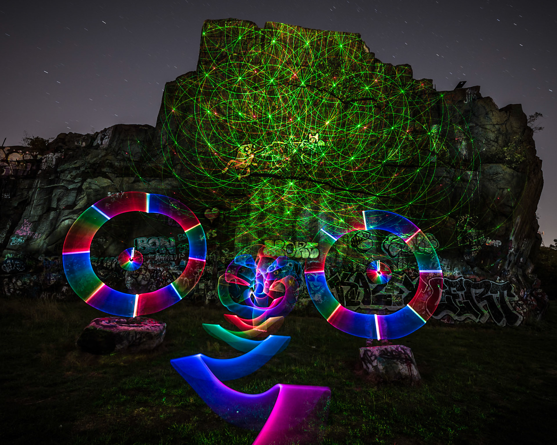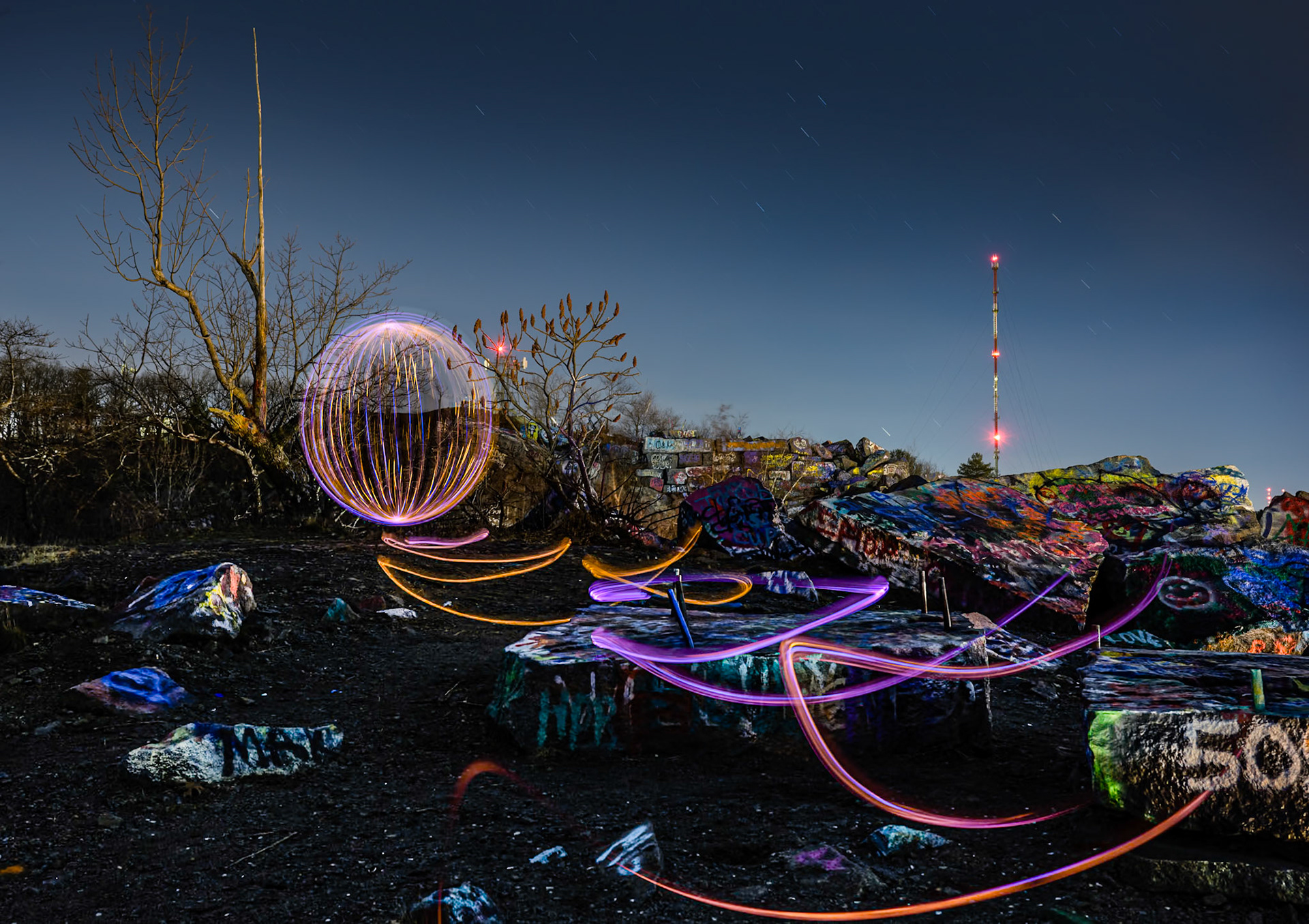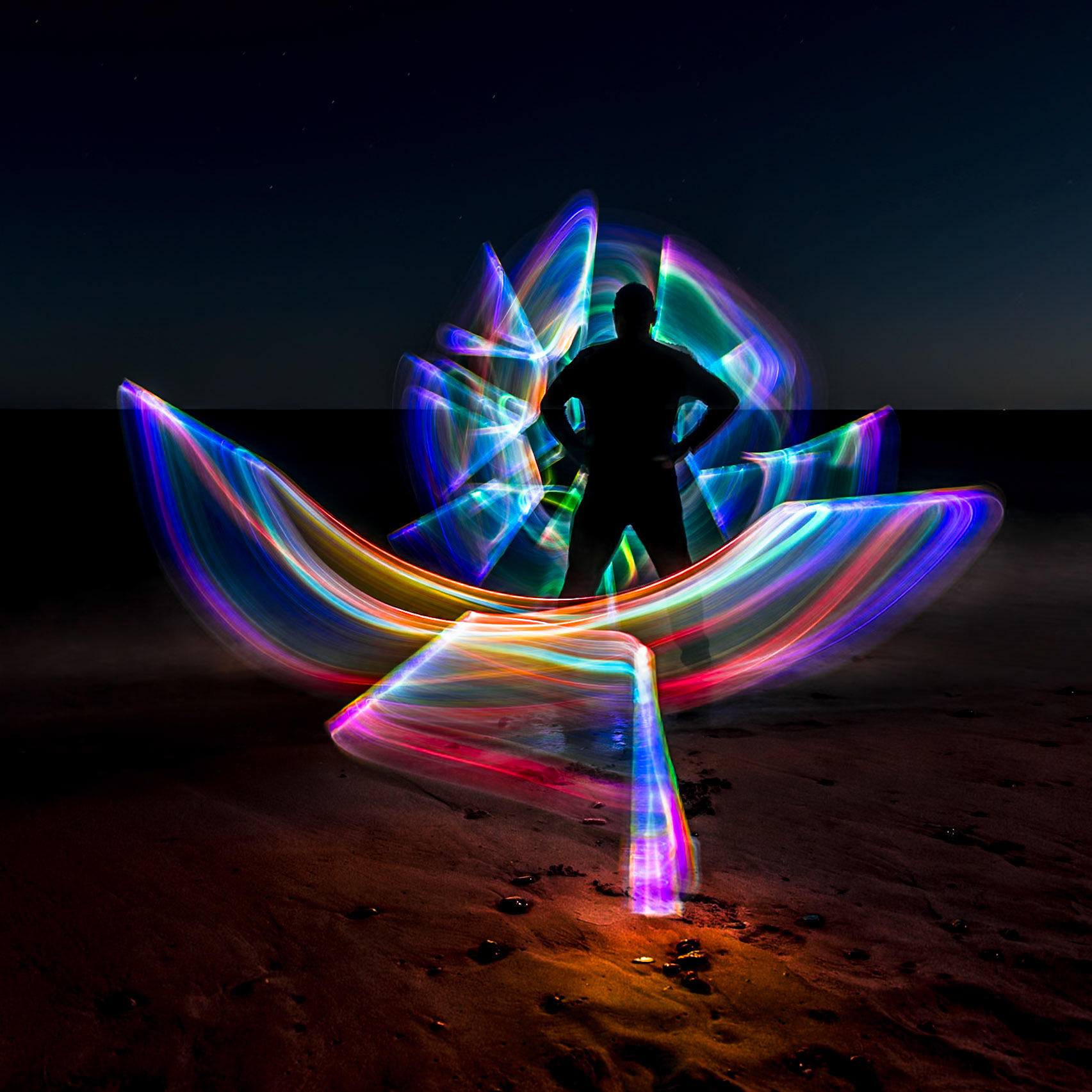 Light drawing (often called light painting) is a long exposure night photography technique where the light source is visible by the camera, and it creates the objects you see. The person doing this disappears when dressed in black. Any tool that lights up can be used, be that a $1 light stick or a $300 specialized tool. I distinguish this from >>light painting, where the light tool itself is not visible. Light drawing is perhaps the only photography discipline where we do not just photograph what is already there, but rather create the main object in the photo. Every single frame is unique, because you can never exactly replicate what you just did.