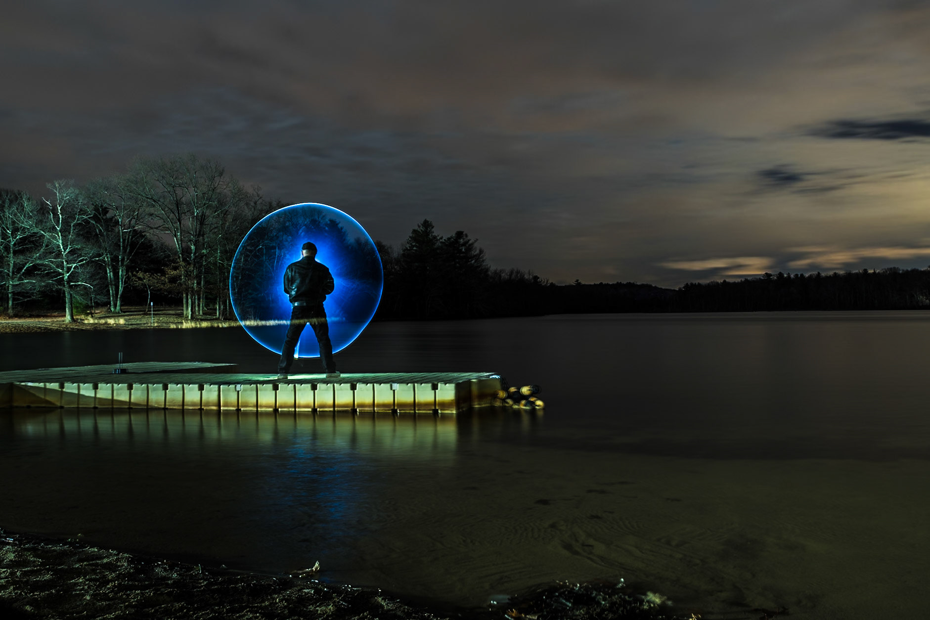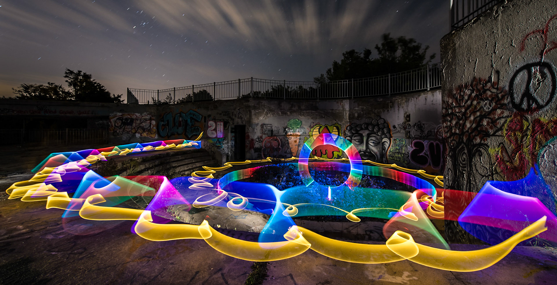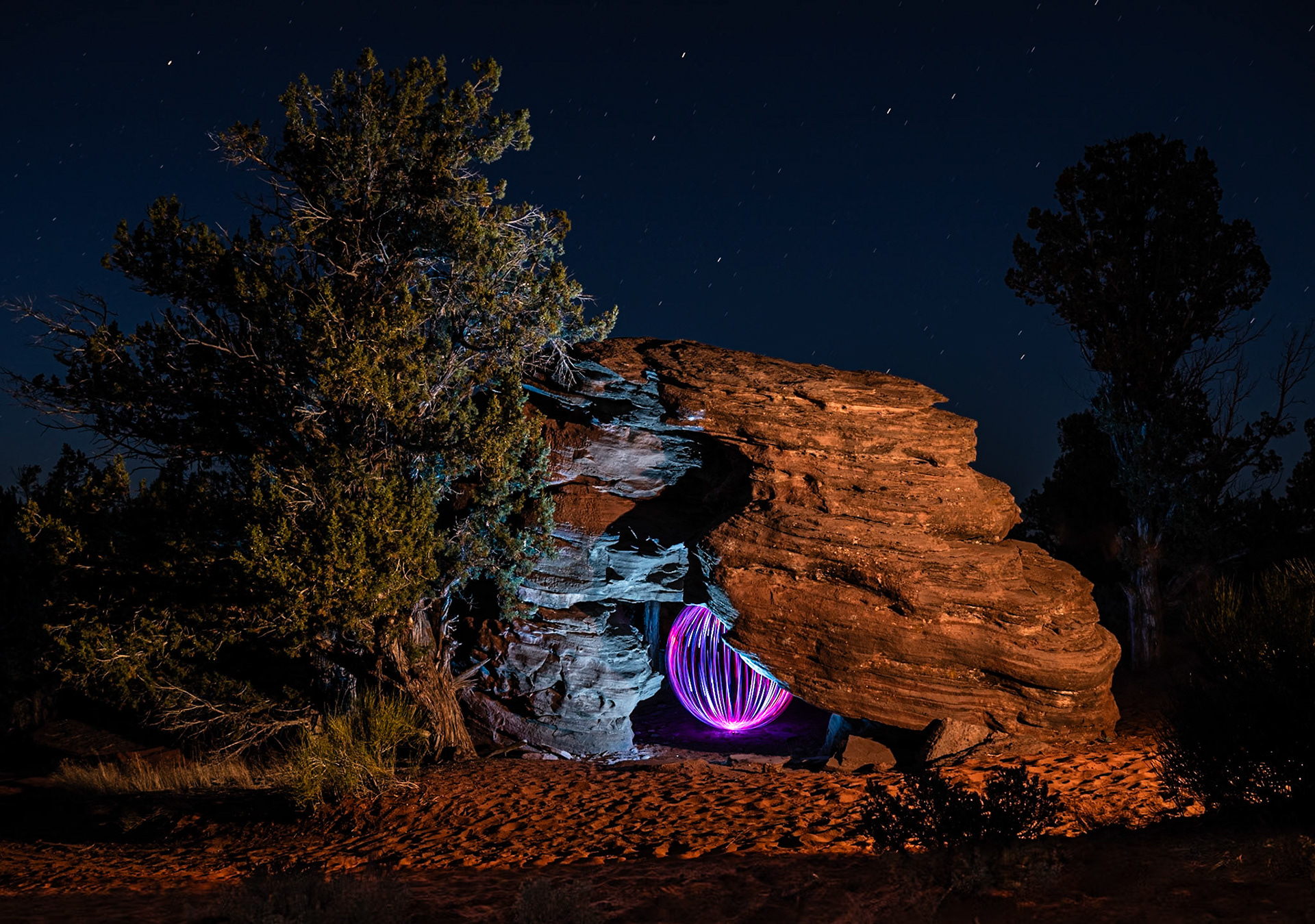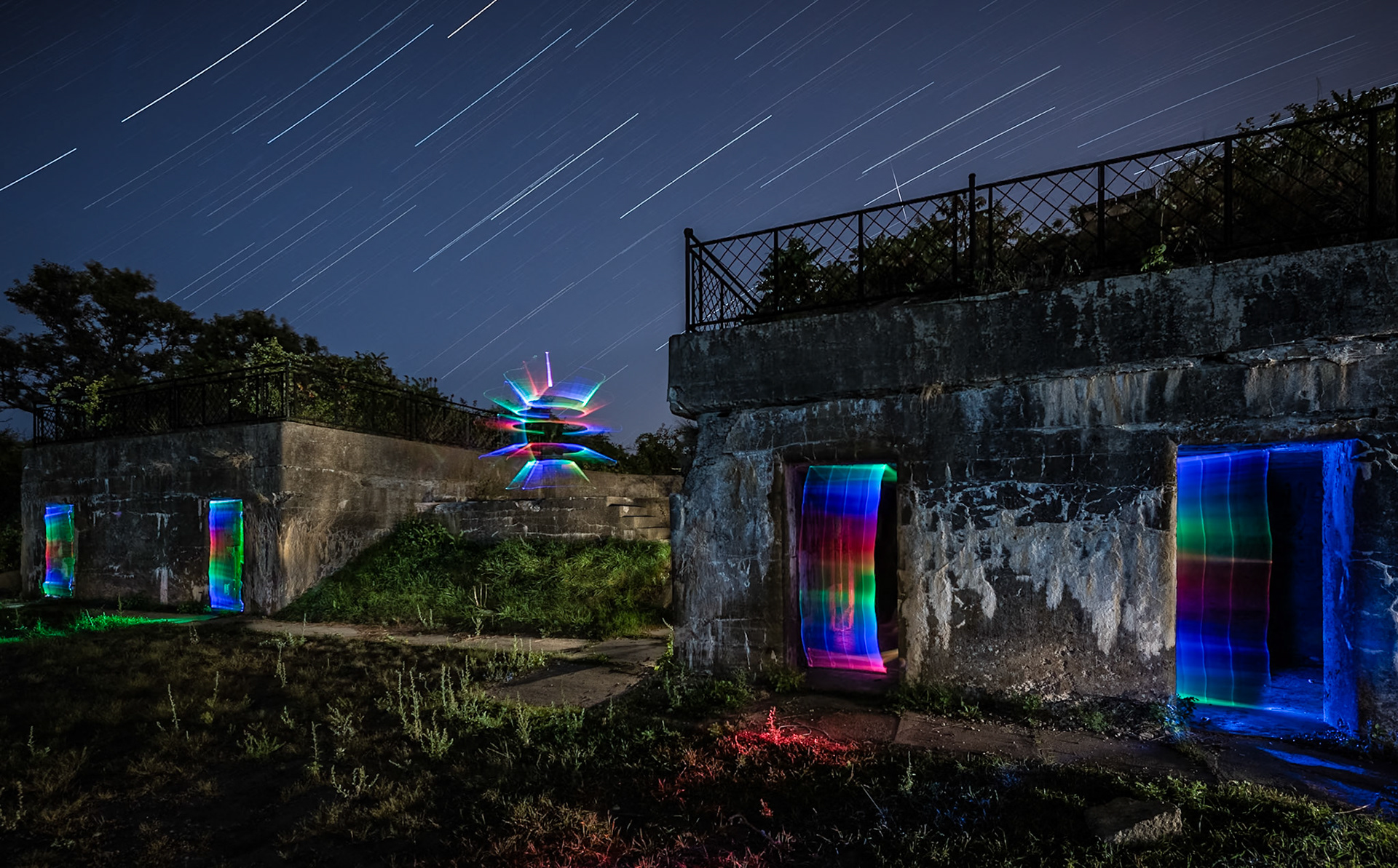 Light drawing (often called light painting) is a long exposure night photography technique where the light source is visible by the camera, and it creates the objects you see. The person doing this disappears when dressed in black. Any tool that lights up can be used, be that a $1 light stick or a $300 specialized tool. I distinguish this from >>light painting, where the light tool itself is not visible. Light drawing is perhaps the only photography discipline where we do not just photograph what is already there, but rather create the main object in the photo. Every single frame is unique, because you can never exactly replicate what you just did.