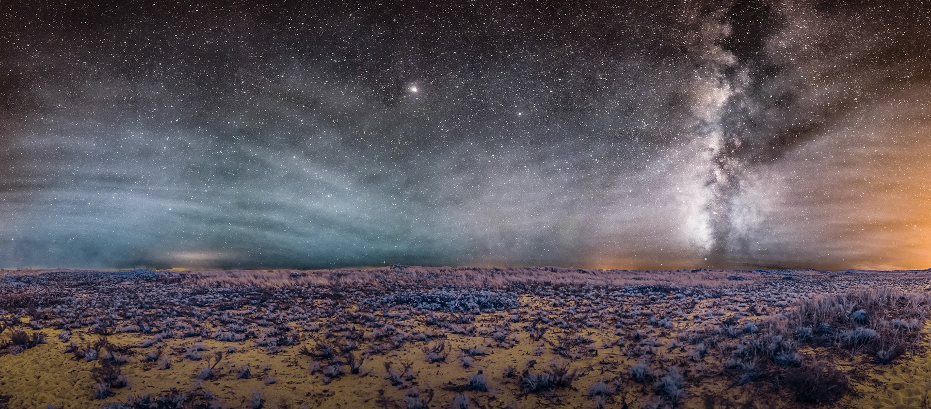 What I found is that imaging the night sky with an infrared camera emphasizes some features. The most intriguing part are those very thin, light clouds in the atmosphere, which one cannot see with the naked eye or a regular camera. These clouds are delicate waves of what is likely clouds of ice crystals in the upper atmosphere. Transparent to visible light, but reflecting Earth’s infrared radiation, which only an infrared camera can see, and only at night.