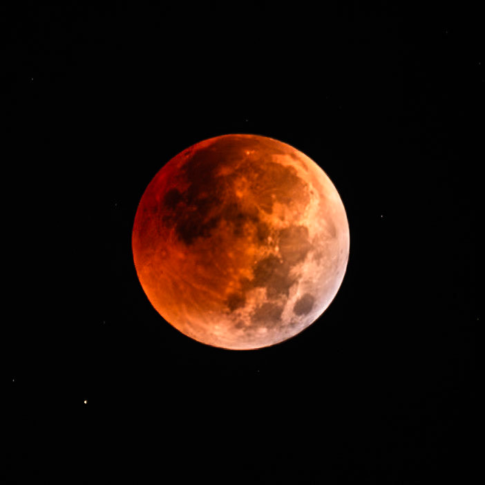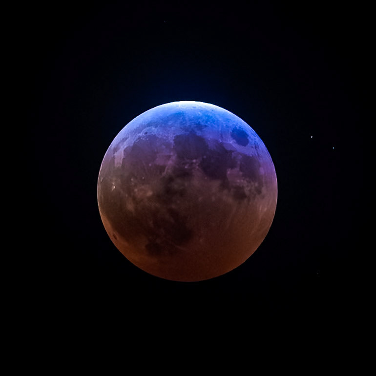 When the moon is fully eclipsed, it turns red, because the white sunlight is refracted by our atmosphere, which acts as a prism, the blue light goes out into space, the red light goes into the shadow and onto the moon. Think of it as sunrise and sunset at the same time. The moon is 16 exposure stops darker than the full moon, but when exposure is increased accordingly, it results in a lovely glowing red moon. The partial shadow is the time when the Earth slowly moves into the center and gradually obscures the moon, and in reverse when it comes back out.